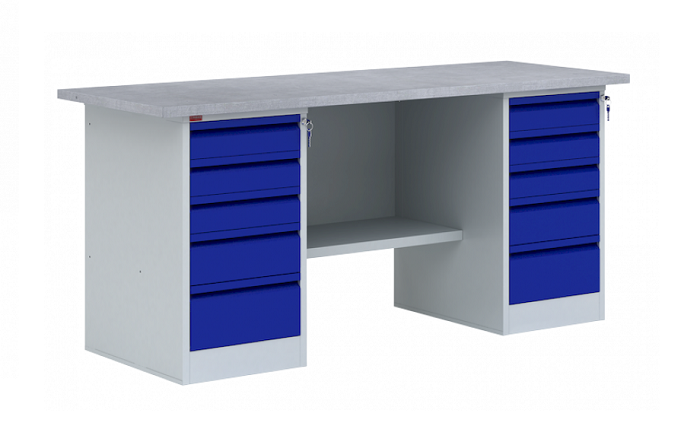 Металлические слесарный верстак ВП-6Т представляет собой рабочий стол для ручной обработки металлических, деревянных изделий, а также предметов, выполненных из других материалов. Металлический верстак используется в мастерских, гаражах, автосервисах и в других рабочих зонах. Он являются основой, как небольшого промышленного производства, так и крупного предприятия. Допустимая равномерно распределенная нагрузка на верстак - 1000 кг, на полку верстачную - 40 кг, на выдвижной ящик - 30 кг. В комплект верстака ВП-6Т, входит: столешница СТ-3 из МДФ, покрытая оцинкованным листовым металлом, стенка задняя металлическая, две тумбы Т-2 с пятью выдвижными ящиками на телескопических направляющих. Тумбы закрываются центральным ключевым замком. Дополнительно на верстак можно установить перфорированный экран соответствующего размера, аксессуары на экран. Цвет: верстак - серый Ral 7035, дверь тумбы - синий Ral 5002